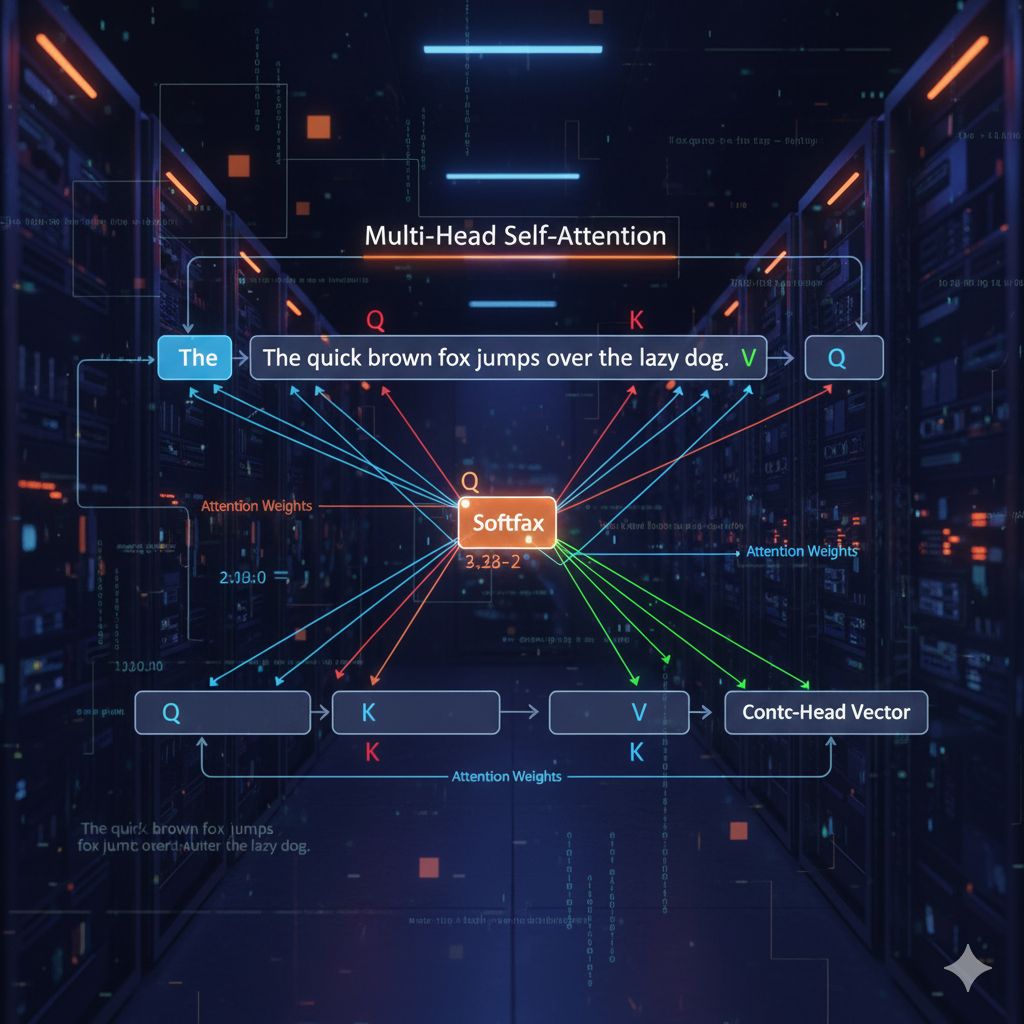 この関連度は、各単語から生成される3つのベクトル「クエリ(Query: Q)」「キー(Key: K)」「バリュー(Value: V)」を用いて計算されます。