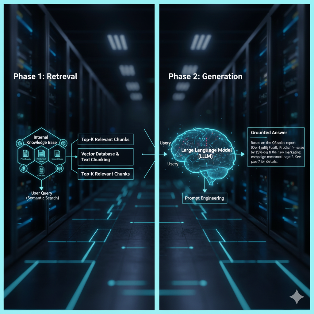 この「知識の壁」を打ち破るのがRAG(Retrieval-Augmented Generation)です。RAGは、LLMが回答を生成する直前に、社内データベースやマニュアルといった外部の知識ソースから関連情報をリアルタイムで検索し、その情報を参考資料としてLLMに提供する仕組みです。