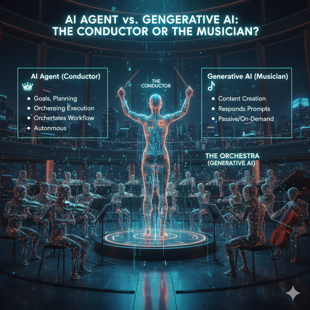 オーケストラに例えるなら、AIエージェントは全体の調和を考え、どの楽器をいつ演奏させるかを決める「指揮者」です。一方、生成AIは、指揮者の指示に従って見事な演奏をする、優秀な一人の「演奏者」と言えます。