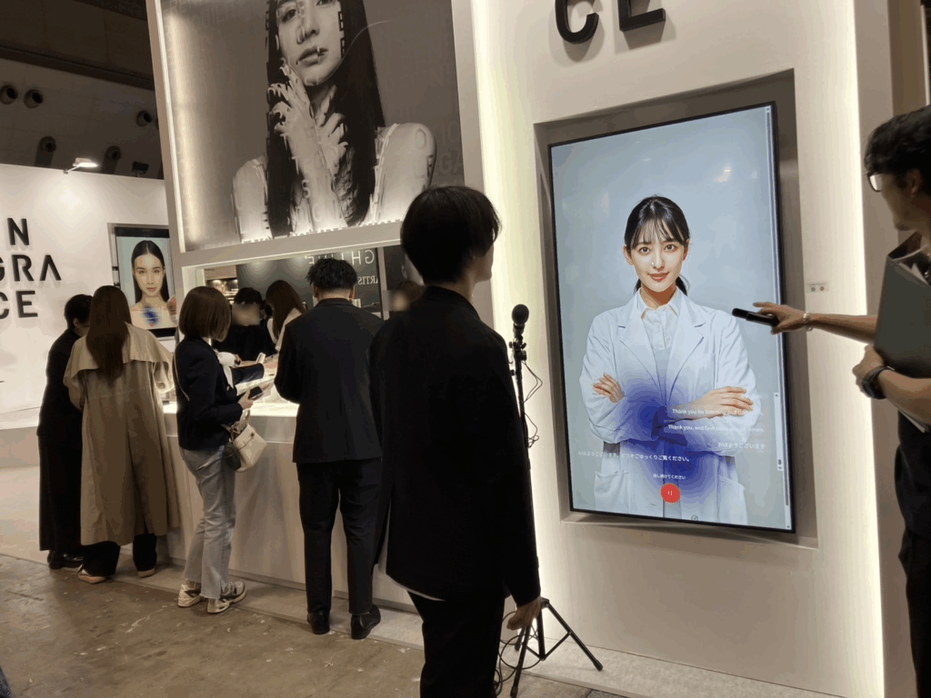 MUK様は、東京で開催された大規模展示会にて『Digital Beauty Advisor』を初めて導入されました。結果として、3日間で3,000回以上の対話を実現。ブース内では一際目を引くAIアバターが来場者と積極的にコミュニケーションを取り、限られたスタッフ数では対応しきれない来場者のサポートを担いました。