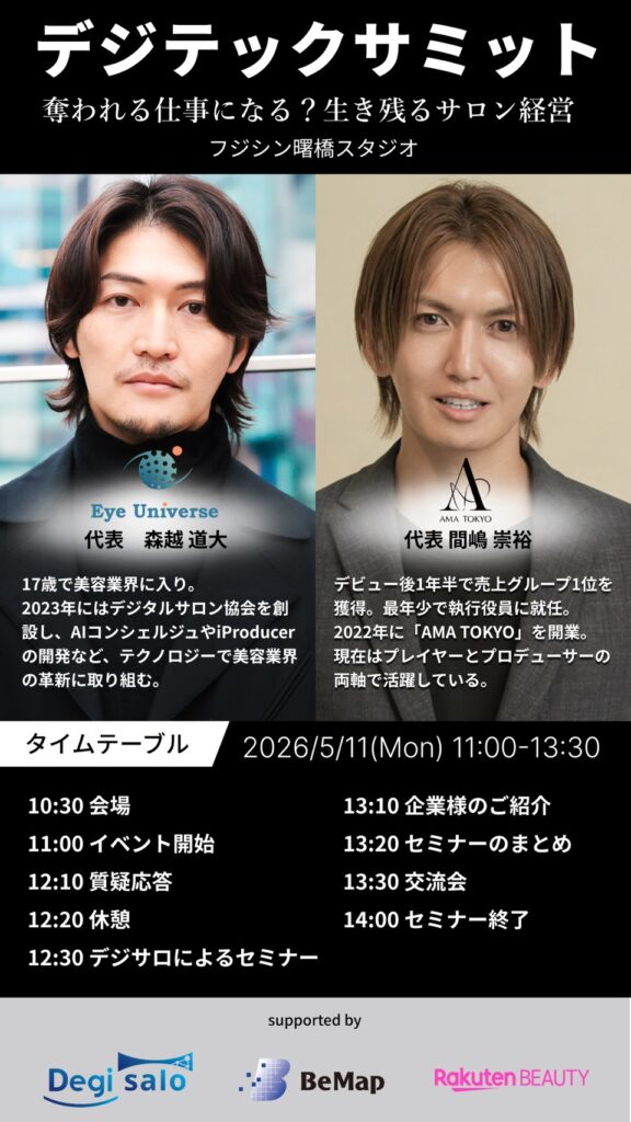 美容業界はいま、技術力や接客力だけでなく、「AIをどう活用するか」が大きな分岐点になっています。 サロン経営も、美容師の働き方も、これから数年で大きく変わっていく時代です。そこでデジタルサロン協会では、楽天 × ビーマップ × デジサロによる特別イベント「デジテックサミット」を開催します。