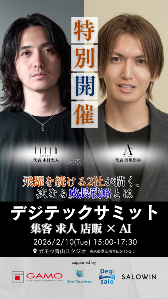 美容業界は集客手法の多様化、人材不足、AI活用の遅れなど、経営課題が複雑化しています。こうした環境下で、成長を続ける企業のリアルな戦略を学ぶ場として「デジテックサミット東京」を開催します。登壇者は、fifth GROUP CEO 木村允人氏と、AMA TOKYO CEO 間嶋崇裕氏。