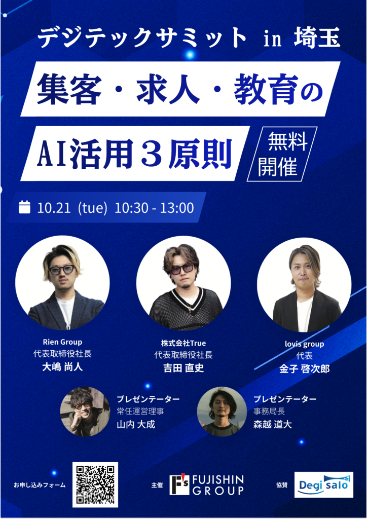 美容業界におけるAI活用の最前線を学ぶイベント「デジテックサミット in埼玉」。本セミナーでは、業界のトップランナーたちが登壇し、サロン経営に欠かせない「集客」「求人」「教育」の3分野におけるAI活用戦略を分かりやすく解説します。